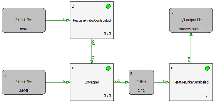 The following example is actually not a useful workflow but is supposed to demonstrate how merger and collector nodes can be used in a pipeline. Have a look at merger_tutorial.toppas. Inspect it in TOPPAS via File -> Open example file.