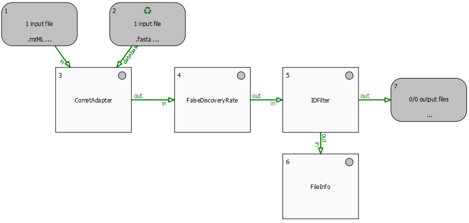 We use the search engine Comet (Eng et al., 2012) for peptide identification. Therefore, Comet must be installed and the path to the Comet executable (Comet.exe) must be set in the parameters of the CometAdapter node. If you installed OpenMS using our binary-package installers, chances are, Comet is already available on your system and in your $PATH environment variable, and the adapter will just work out of the box.