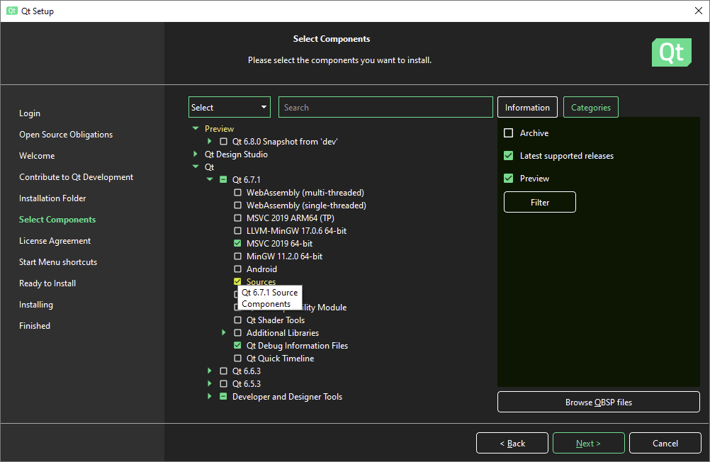 Go to https://www.qt.io/download and find the download for the Qt binaries installer, download it and run the Qt binary installer. You will need to create a free user account with Qt, and log into that account during installation. The installer will ask for an installation directory, choose, e.g. c:\dev\qt6. From the components choose a matching version, e.g. Qt 6.7.1 and pick the MSVC binaries (e.g. MSVC 2019 64-bit), the Sources (for Qt headers) and Qt Debug Information files (optional).
